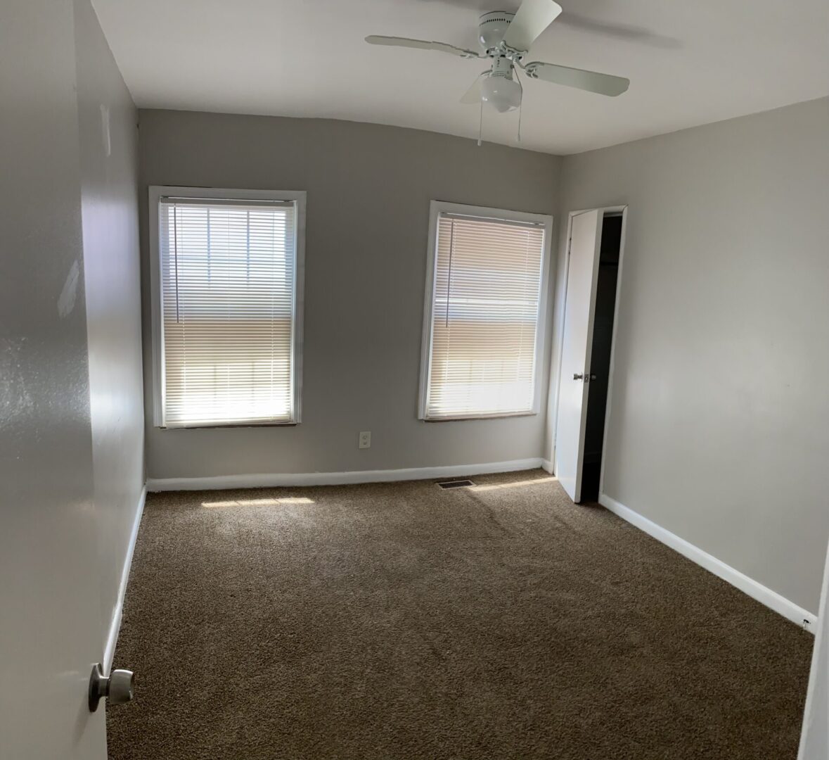 The upper level includes two additional bedrooms, each with vinyl flooring, window blinds, and ceiling fans for added comfort.